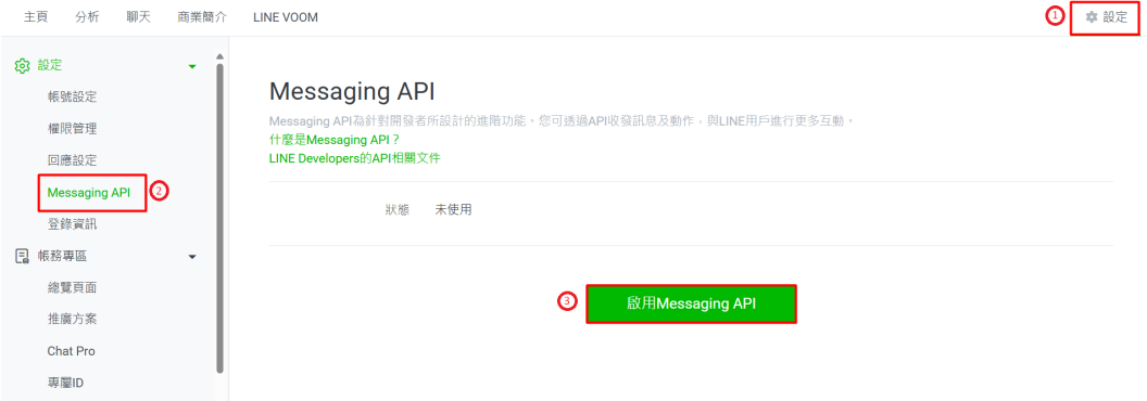步驟二:點擊 設定 > Messaging API > 啓用 Messanging API