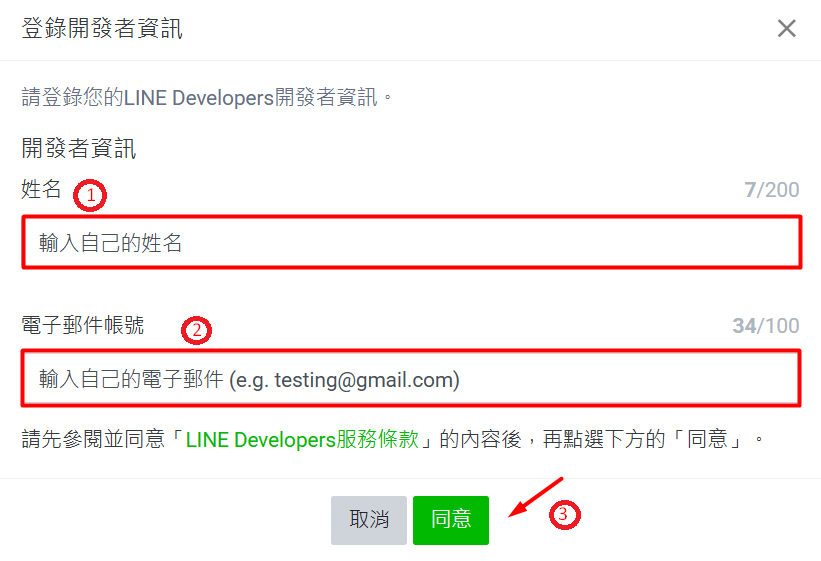 步驟三:登錄開發者資訊的頁面,在姓名和電子郵件帳號的欄位填上相關資訊,然後點擊同意。