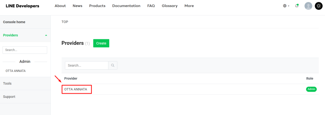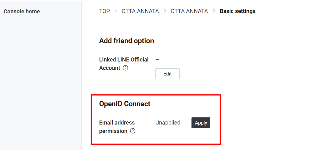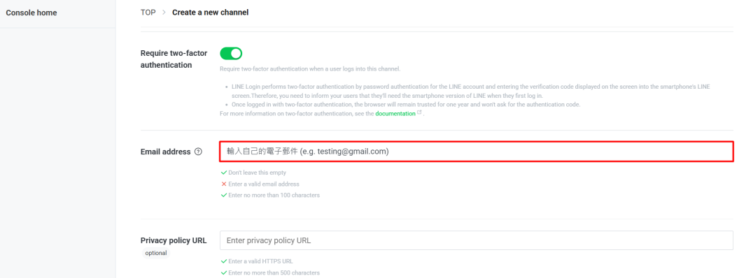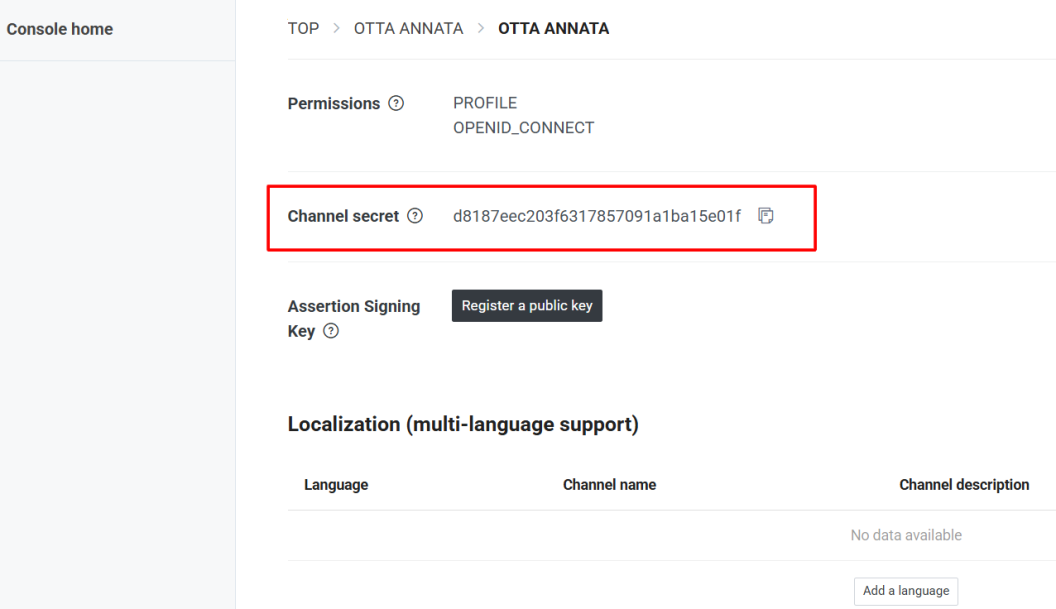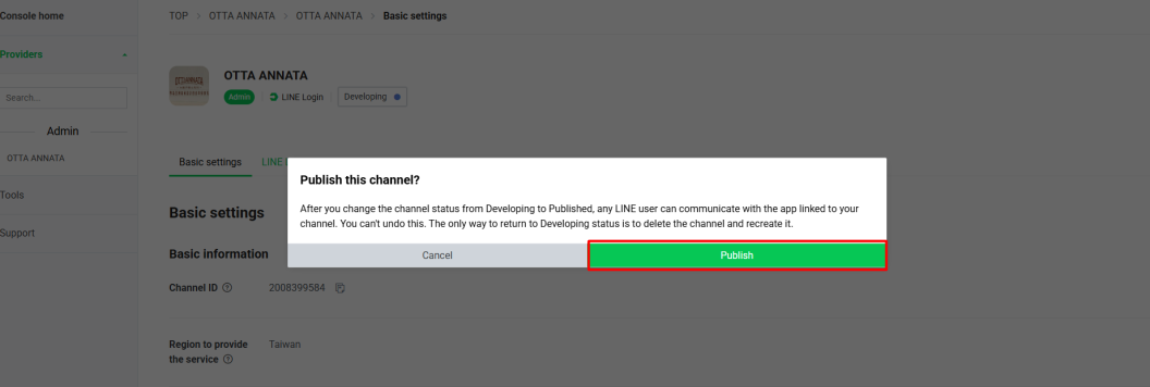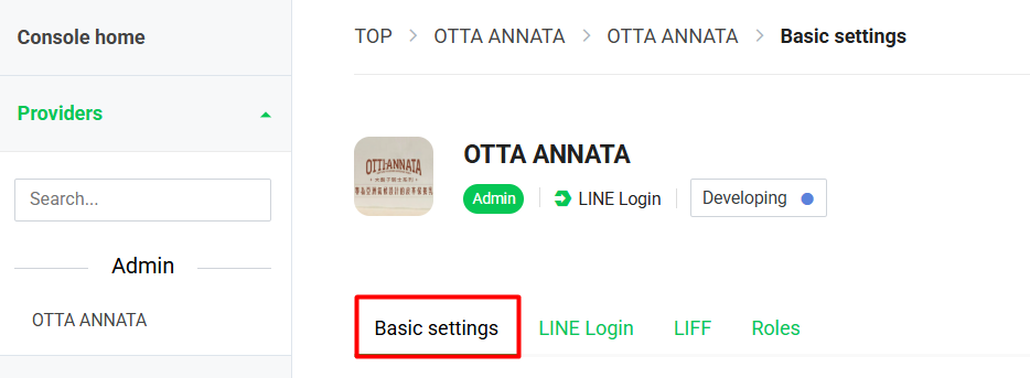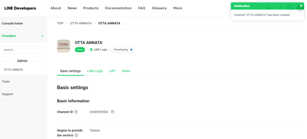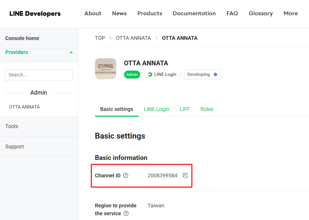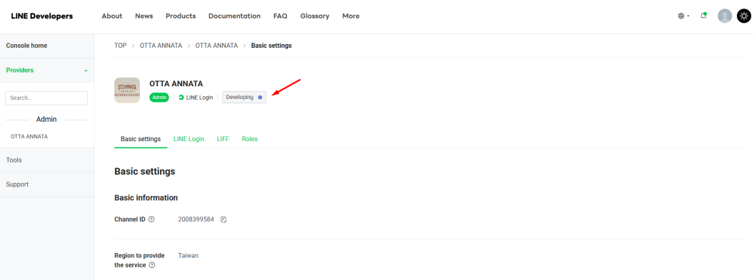LINE Developers Console 的頁面:
