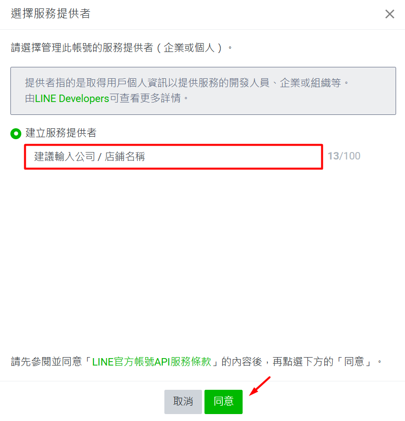 步驟四:在建立服務提供者的欄位填上公司 / 店鋪名稱后,點擊同意。