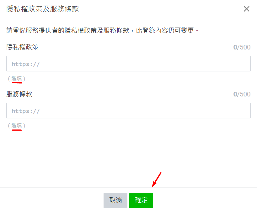 步驟五:隱私權政策和服務條款是選填的欄位,可以直接點擊確定跳過。