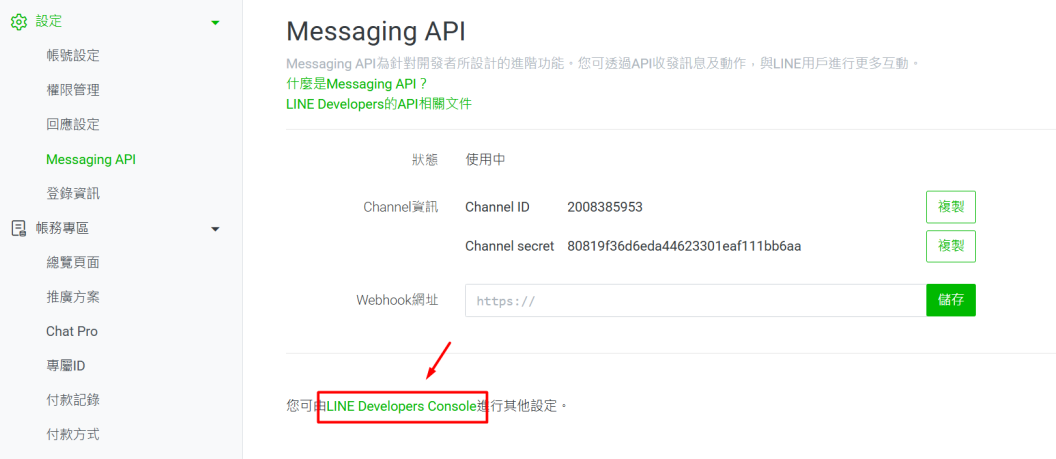 步驟一:Messaging API 創建成功後,點擊下方的 LINE Developers Console 進行設定。