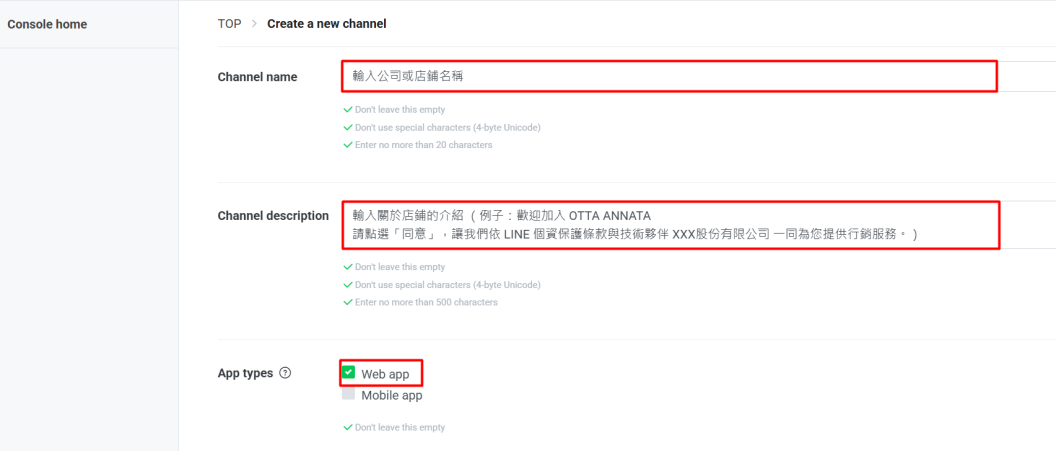 (ii) 輸入必填的欄位 Channel name 和 Channel description 后,在 App types 勾選 Web app