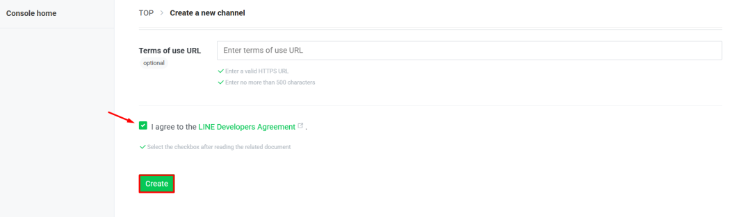 (iv) 最後打勾同意 LINE Developers Agreement 后,點擊 Create