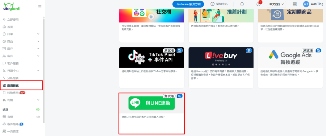 步驟一:登入 SiteGiant 賣家中心 > 前往應用擴充 > 官網與購物 App > LINE 登入