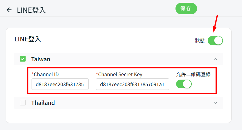 步驟二:將 LINE 登入的狀態打開後,回到 LINE Developers 的頁面,將 Channel ID 和 Channel secret 複製和貼上,再點擊保存。