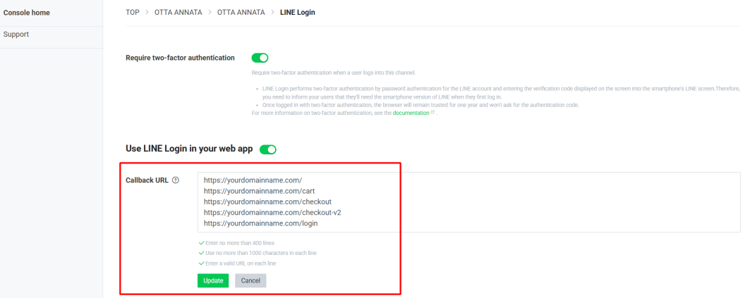 步驟三:切換到 LINE Login 的頁面,在 Callback URL 點擊 Edit,並填寫您的域名然後點擊 Update,如下所示