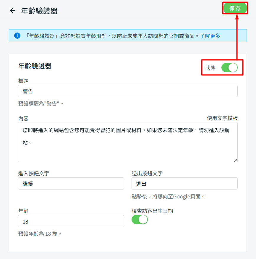 步驟二:啟用年齡驗證狀態 > 設置年齡驗證相關設定 > 保存。