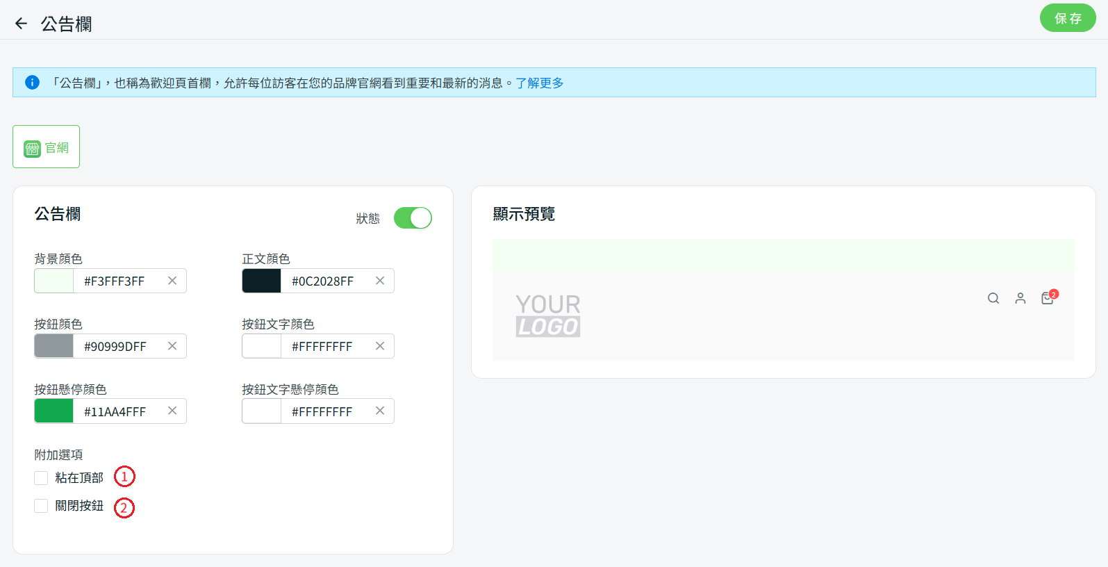 步驟二:啟用公告欄狀態 > 客制化背景、文字與按鈕顏色 > 選擇啟用或停用附加選項。