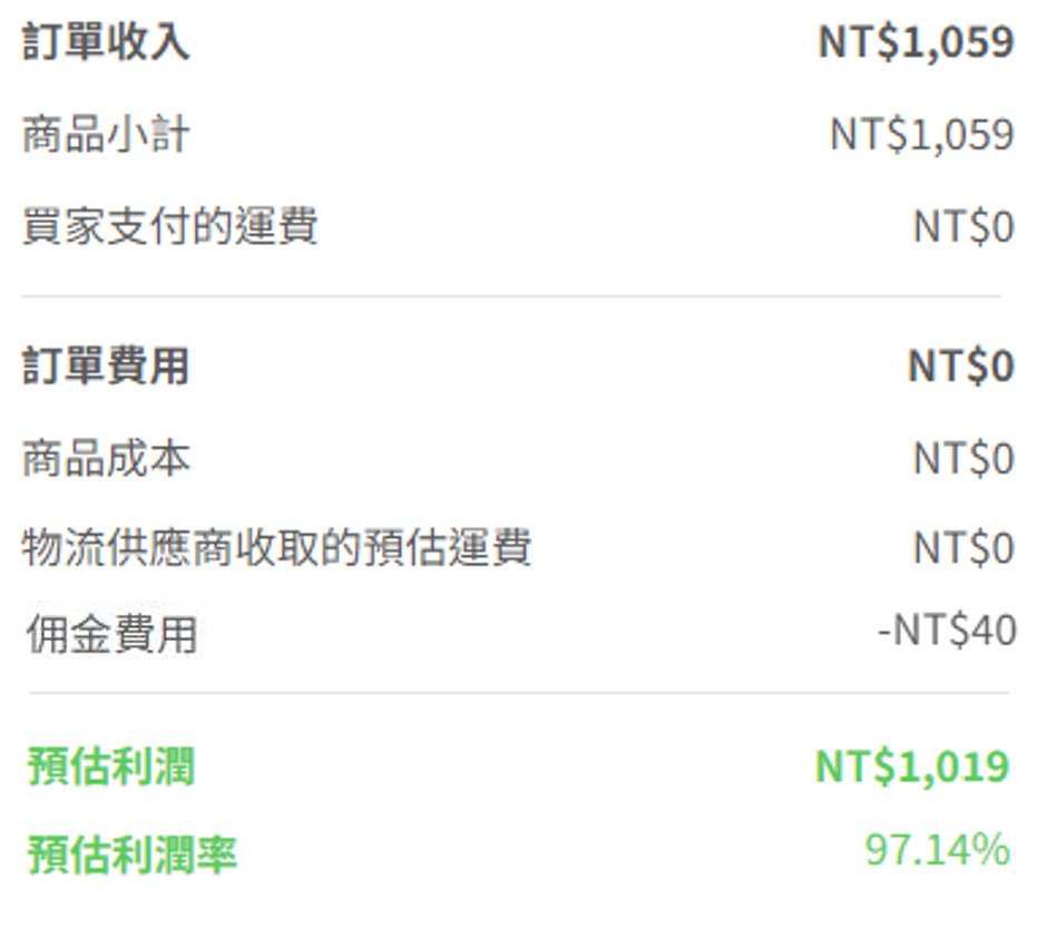 步驟二:您將能夠查看訂單預估利潤的詳細分項,如下所示: