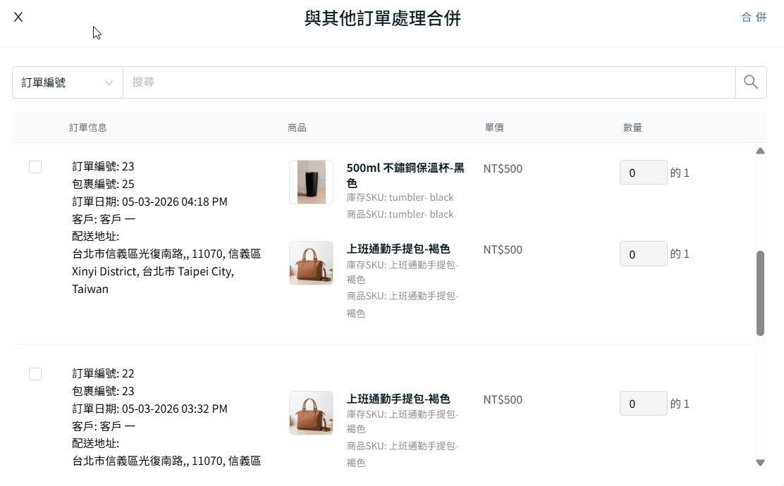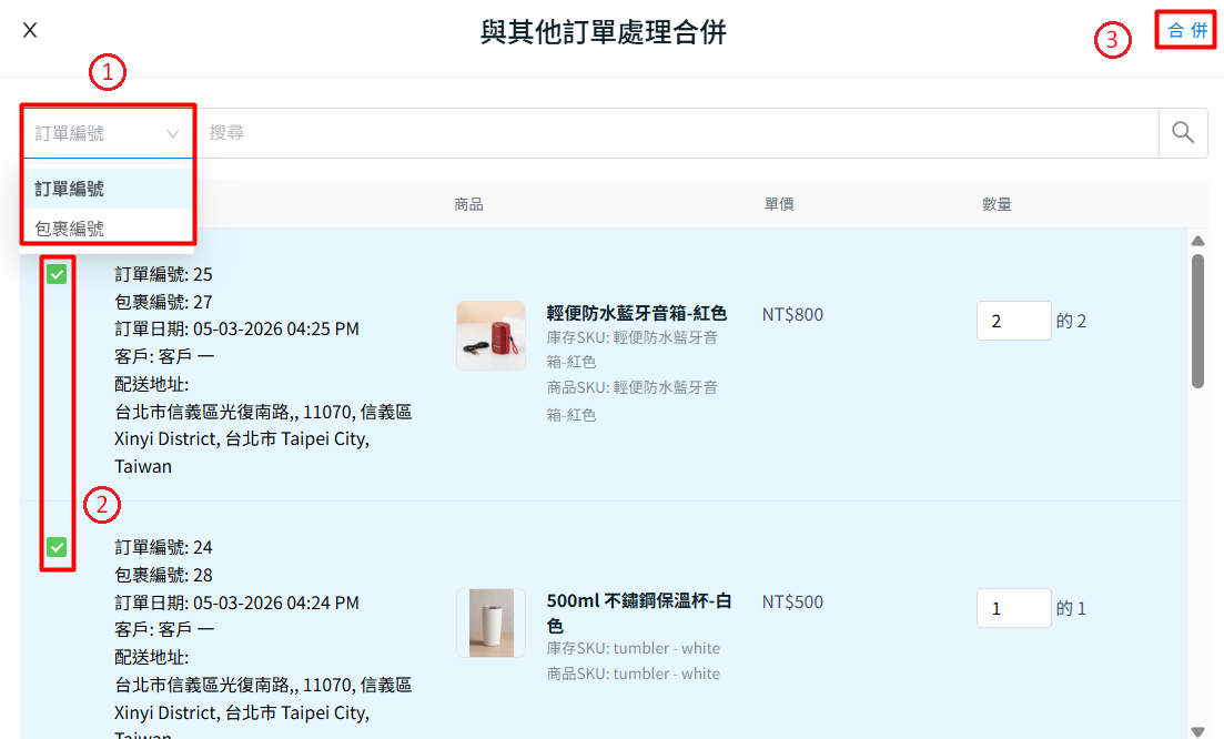 📌注意:僅當訂單來自同一位客戶且配送地址完全相同(包含空格與大小寫)時,系統才會顯示可合併的訂單編號。