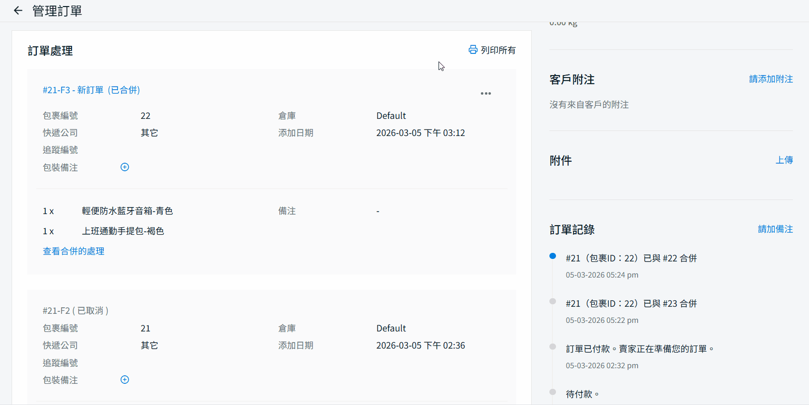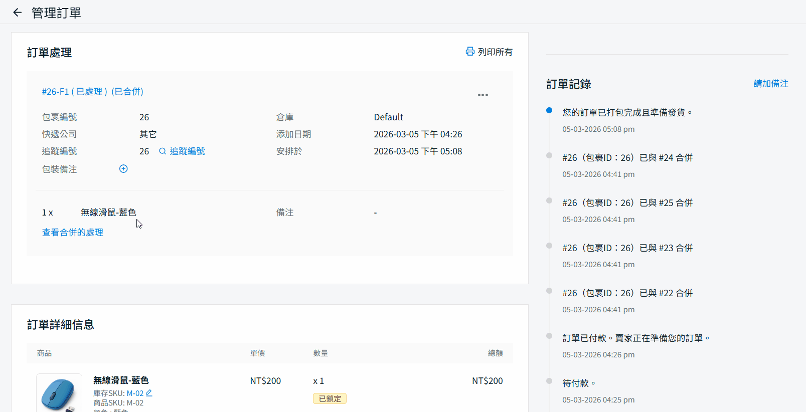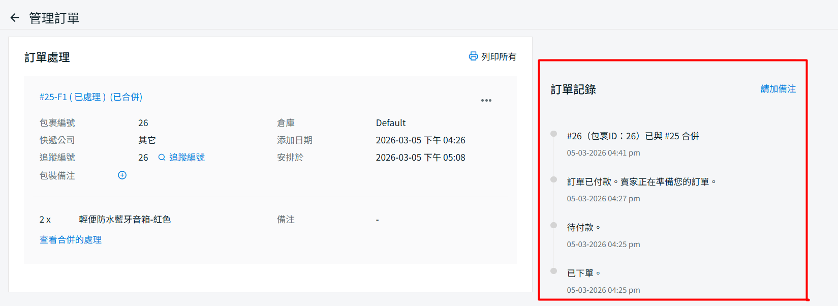 訂單紀錄部分,顯示訂單 #26 已與訂單 #25 合併。由於 #26 排在第一位,因此視為主訂單,而 #25 則已合併至該訂單並於同一發貨處理下完成。