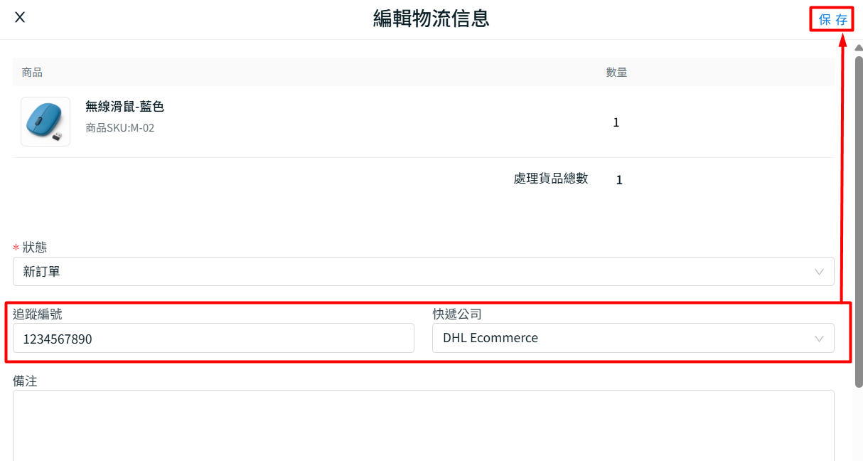 步驟六:更新追蹤編號 > 選擇快遞公司 > 點擊保存