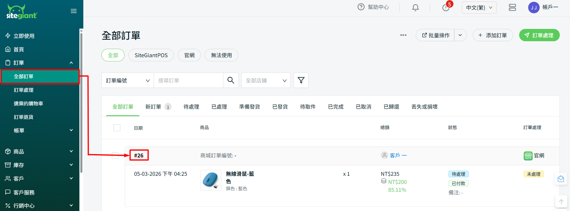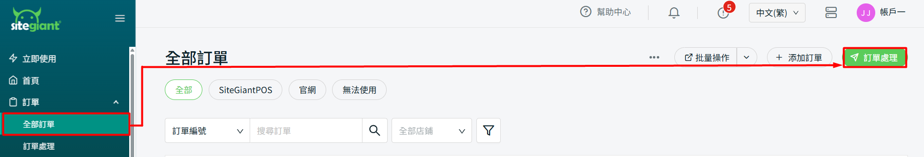 步驟一:前往訂單全部訂單 > 點擊訂單處理