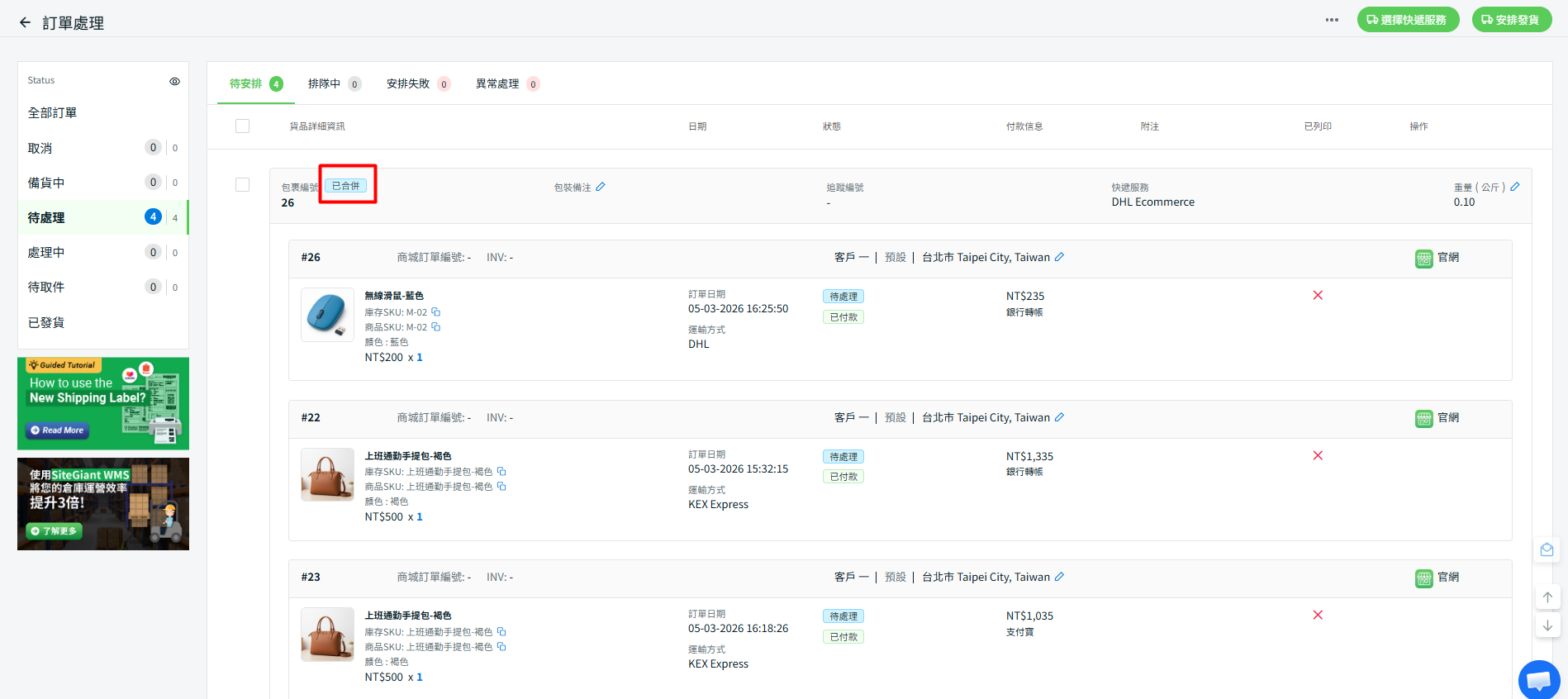 步驟二:合併後的訂單將會使用同一個包裹編號,並可在待處理選卡中查看。