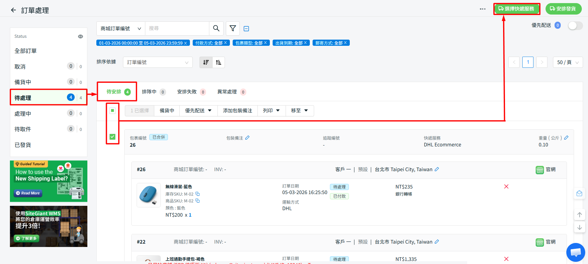步驟三:前往待處理選卡中 >待安排 > 選擇合併後的訂單選擇快遞服務 > 即可如常為訂單安排發貨。