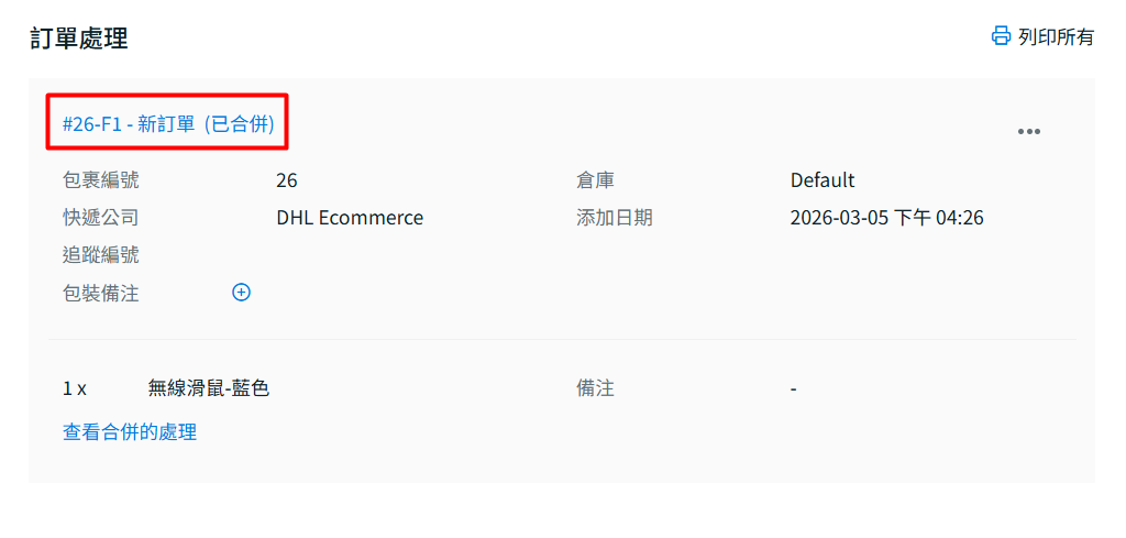 點擊查看合併的處理以查看已合併的訂單編號。