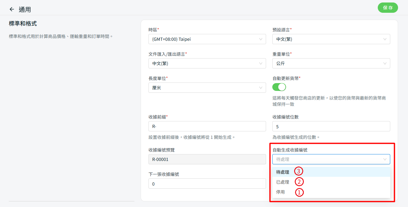 📌注意:一旦將自動生成收據編號設置為待處理或已處理,如果您直接將訂單標記為已完成,收據編號也將被生成。