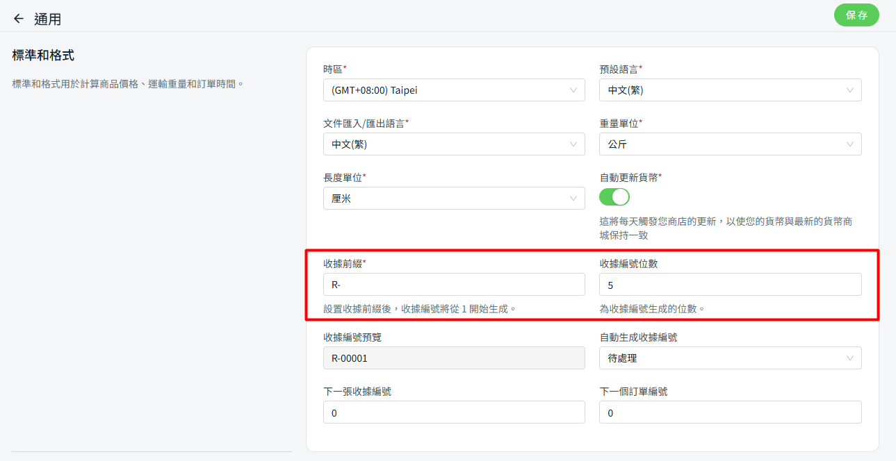 收據前綴是顯示在收據編號前方的英數字代碼。您可依需求設定收據前綴格式,也可啟用系統自動生成收據編號功能。