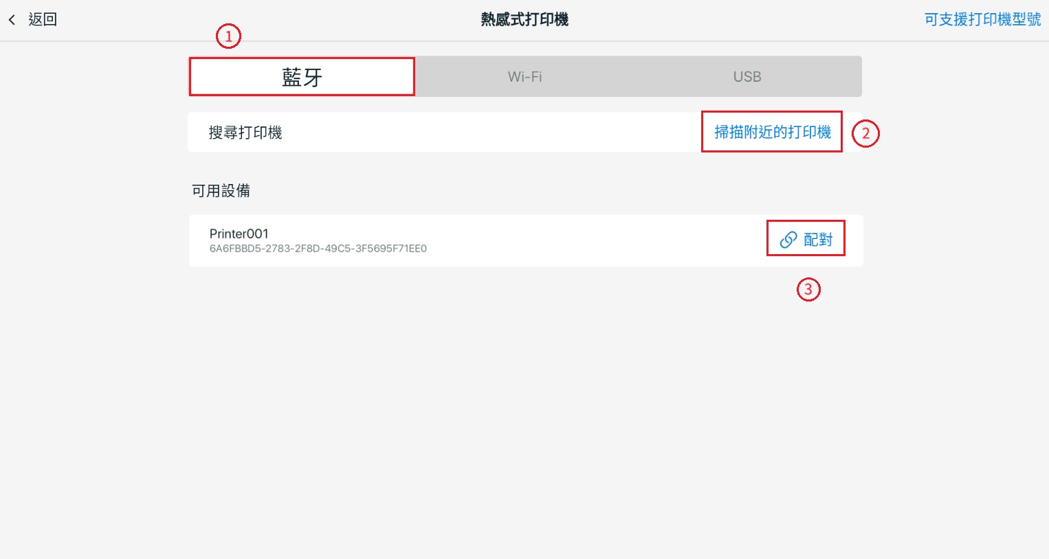 步驟三:選擇藍牙> 點擊掃描附近的打印機 > 點擊您要連接的打印機裝置。