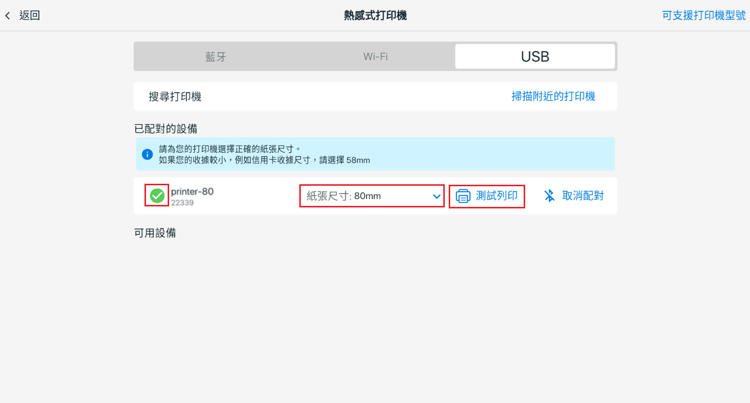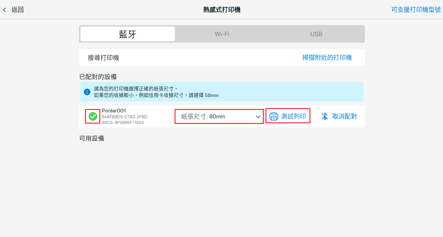 步驟四:成功連接後,系統會顯示綠色勾勾。請確保紙張尺寸設定為 80mm,以獲得最佳顯示效果。點擊測試列印以確認打印表機已正常連接。