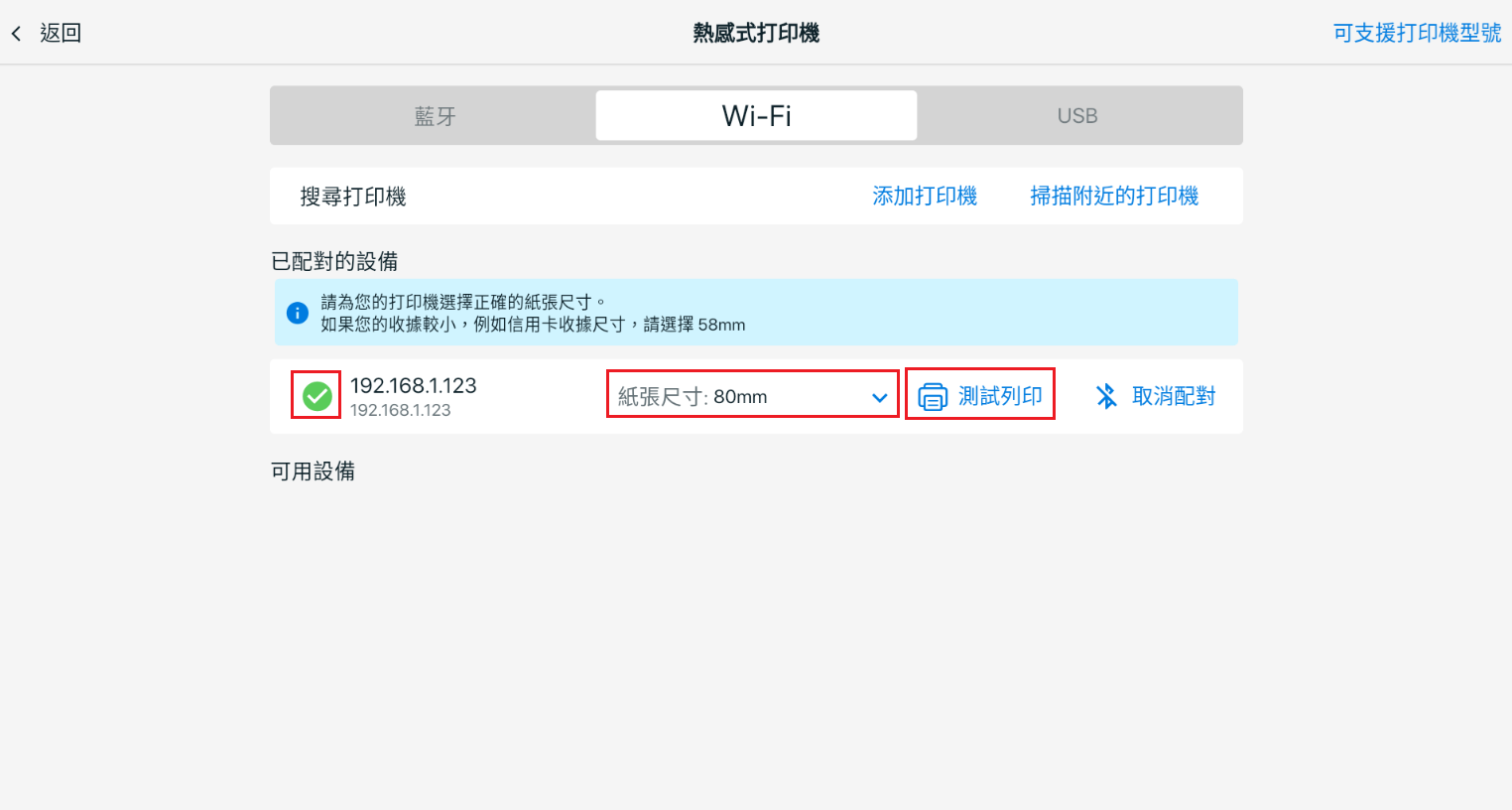步驟四:成功連接後,系統會顯示綠色勾勾。請確保紙張尺寸設定為 80mm,以獲得最佳顯示效果。點擊測試列印以確認打印機已正常連接。