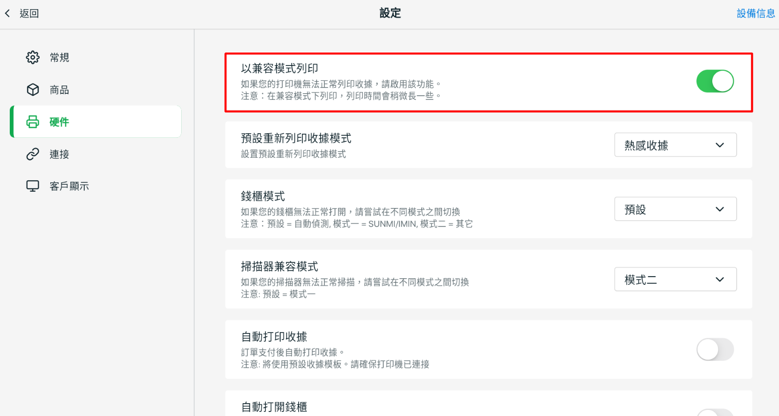 若您的打印機無法正常列印收據,您可以啟用以兼容模式列印。