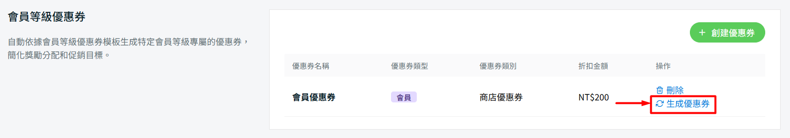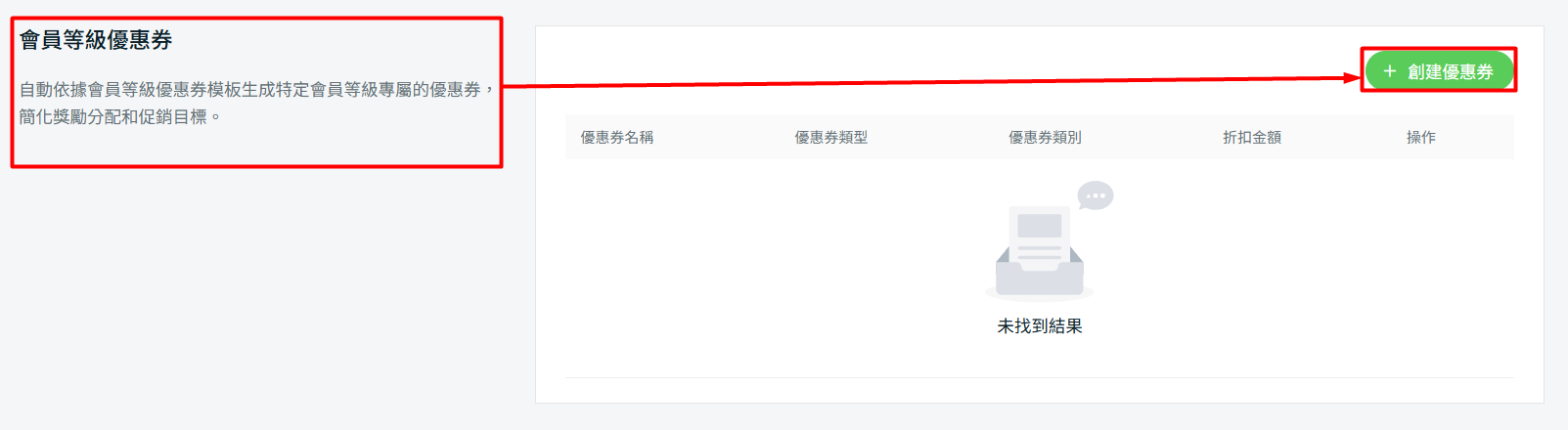 步驟三:向下捲動至會員等級優惠券部分 > 點擊創建優惠券