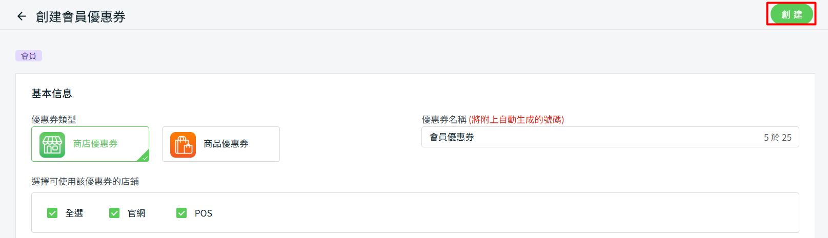 1. 優惠券類型:選擇要套用商店優惠券或商品優惠券
