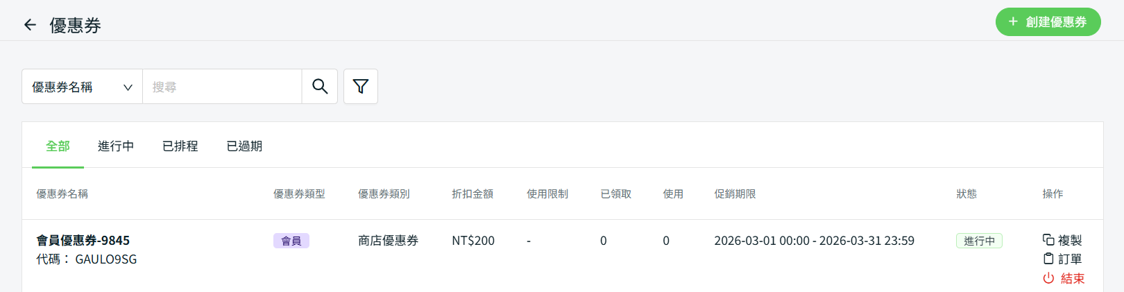 步驟二:您可於側邊欄的行銷中心>促銷活動 > 優惠券中查看已生成的優惠券。