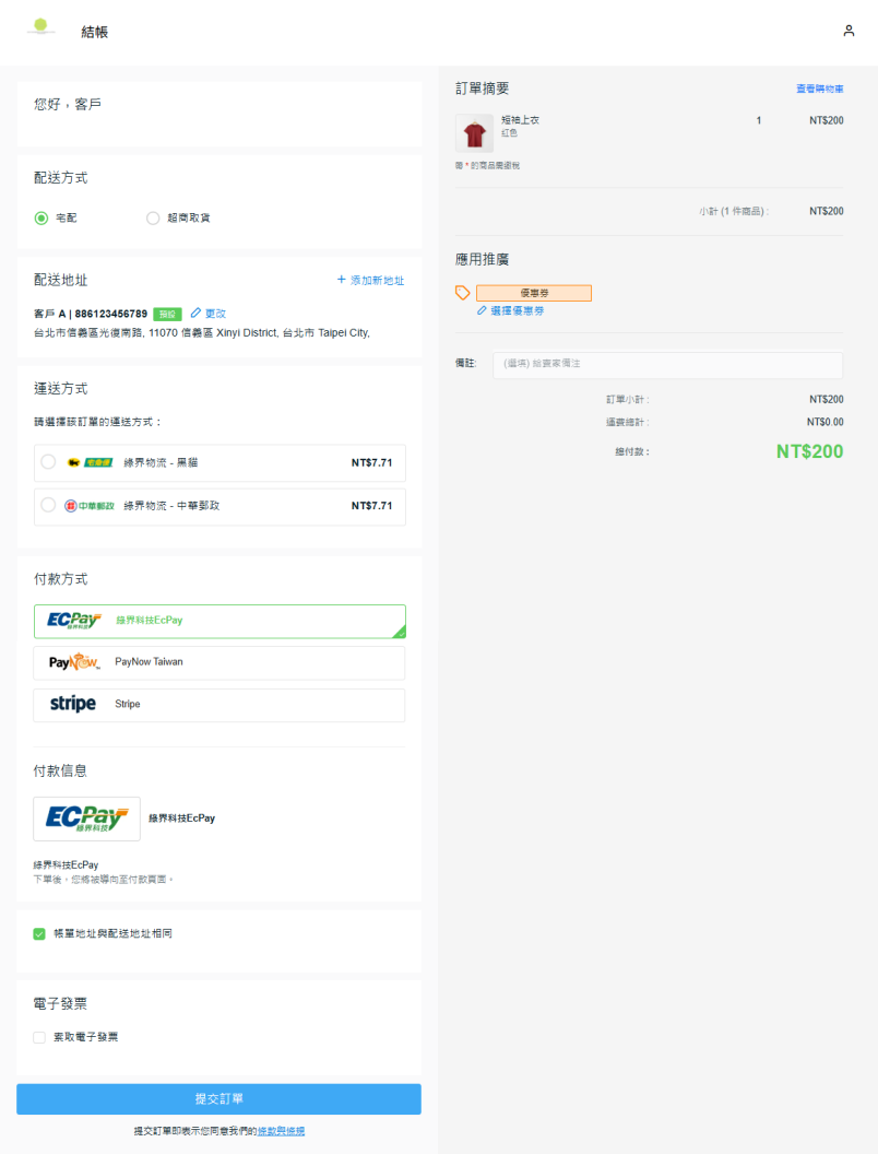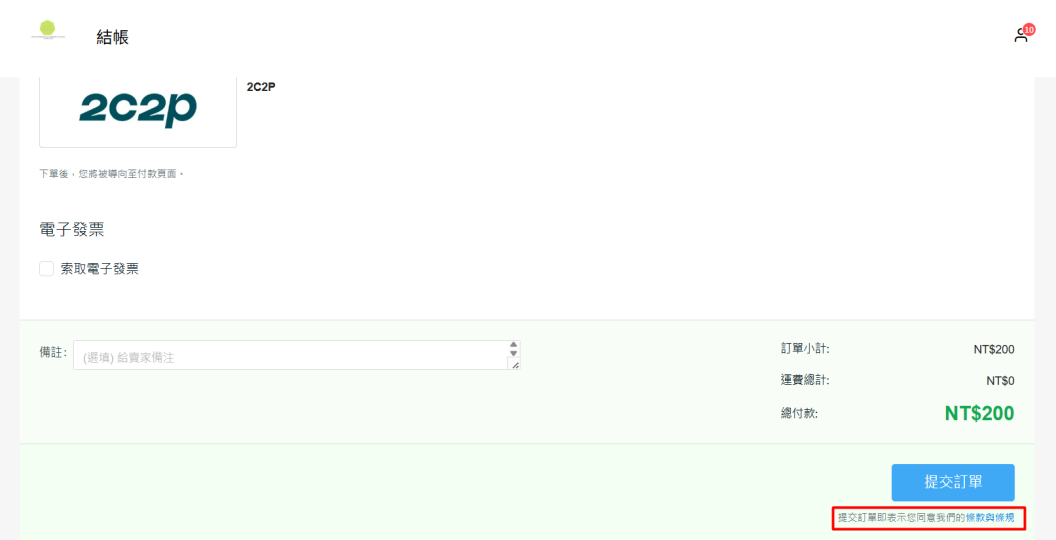 此設定可讓您選擇是否在結帳頁面顯示條款與條規。啟用後,系統將於提交訂單按鈕下方顯示。若客戶點擊提交訂單,即視為已同意本官網之條款與條規。