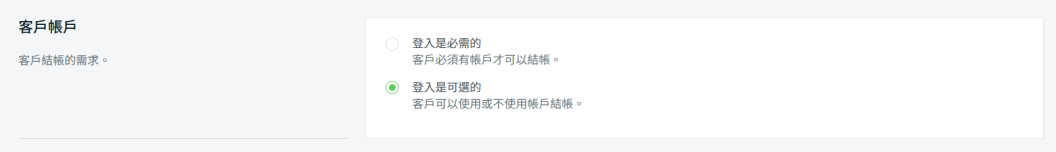 設定客戶於結帳時是否一定要登入。若選擇登入是必需的,客戶需先註冊並登入帳號後才能進行結帳;若選擇登入是可選的,客戶可選擇以訪客身份結帳,或登入既有帳號完成結帳。