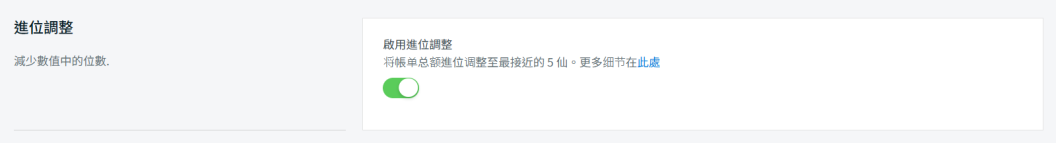 此設定可讓系統依照馬來西亞的進位規則,將訂單總金額進位至最接近的五仙。啟用後,結帳金額將自動進行調整,例如 RM10.02 會進位為 RM10.00,而 RM10.03 則會進位為 RM10.05。