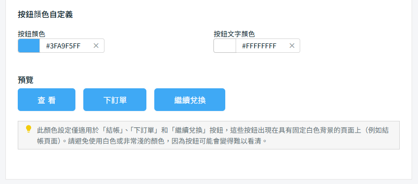 此設定可讓您自訂結帳頁面中結帳、提交訂單及前往兌換按鈕的顏色。