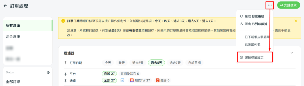 步驟二:點選右上角的更多… > 運輸標籤設定。