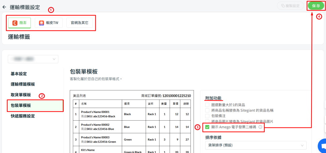 步驟三:選擇銷售通路和店鋪 > 包裝單模板,然後到附加功能開啓顯示 Amego 電子發票二維碼后再保存。