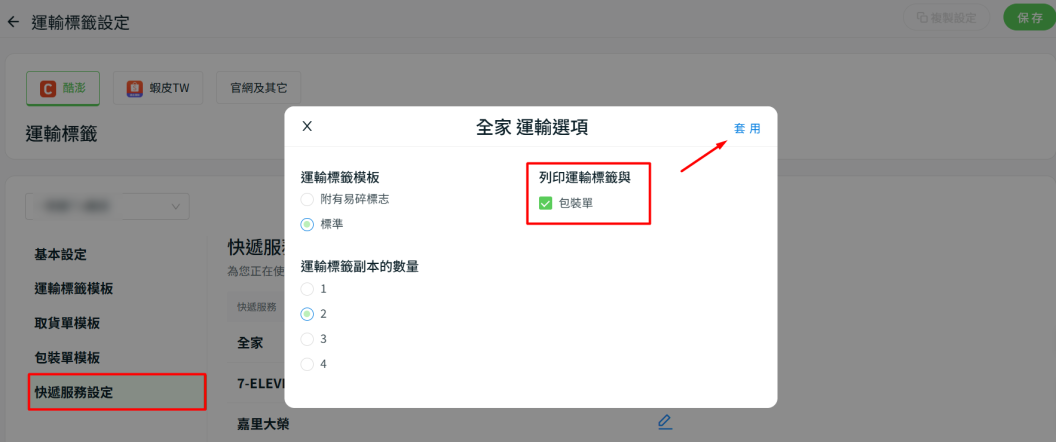 建議在列印運輸標籤時一併列印包裝單,可前往快遞服務設定中開啟包裝單選項即可完成設定。