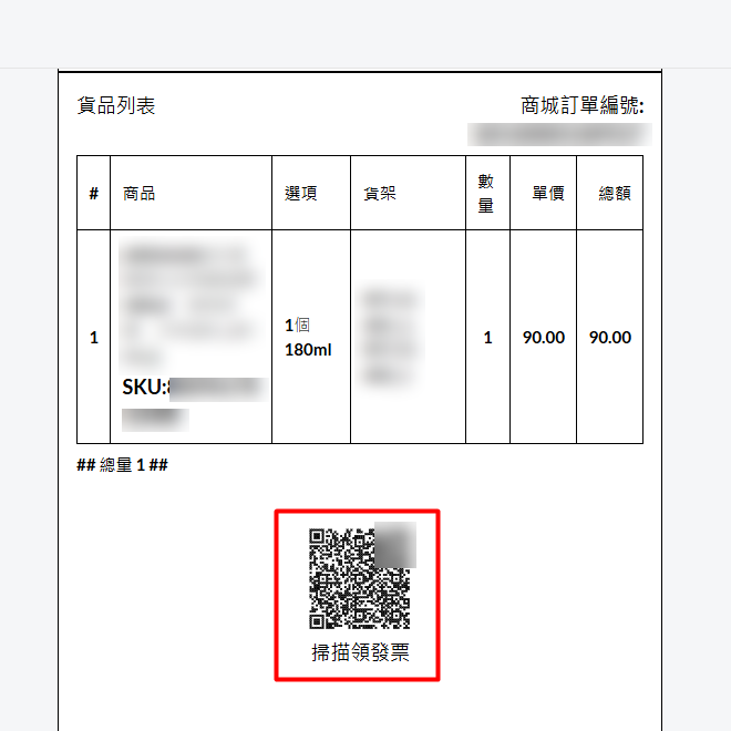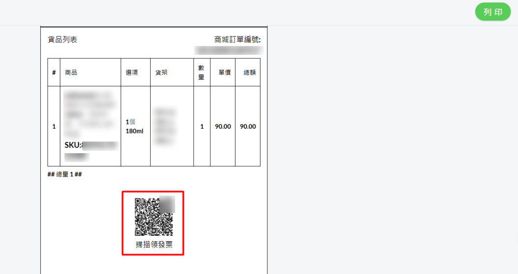 當您完成 Amego 光貿串接設定 後,於處理訂單時即可直接列印含有電子發票二維碼的包裝單(明細),隨貨放入包裹中,讓客戶在收到商品後可直接掃描二維碼取得電子發票。