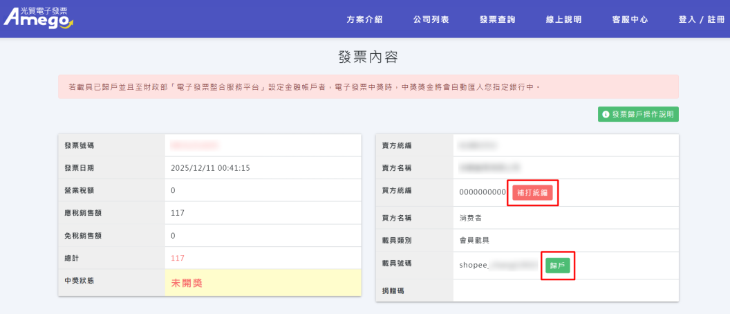 並可於發票頁面中進行歸戶設定及補打統編。