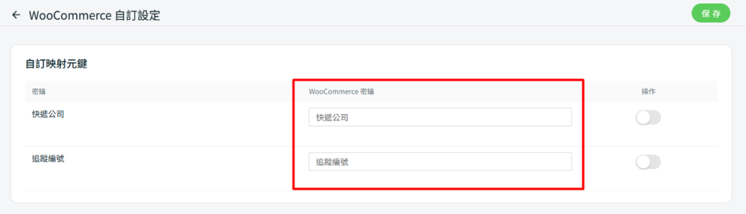📌注意:WooCommerce 密鑰可為任意值,該密鑰的值將作為自訂欄位名稱,當訂單在 SiteGiant 處理完成後,系統會於 WooCommerce 訂單詳情頁中自動創建此欄位。