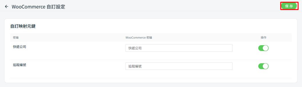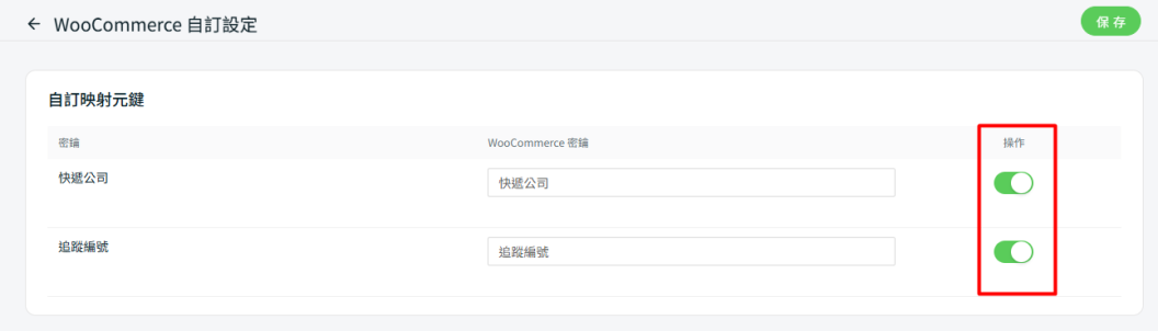 步驟三:啟用快遞公司與追蹤編號的操作狀態,確保這兩項資訊能同步至 WooCommerce 訂單詳細資料頁。