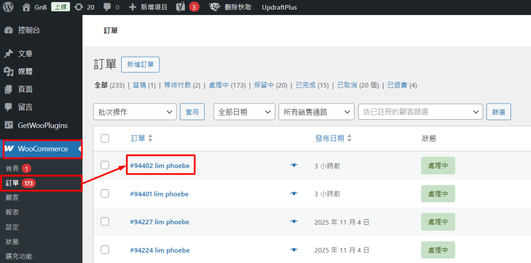 步驟六:當客戶在您的 WooCommerce 網店下單後,您可前往 WooCommerce > 訂單,點擊進入訂單詳細資料頁,即可查看客戶在結帳時所選擇的運送方式。