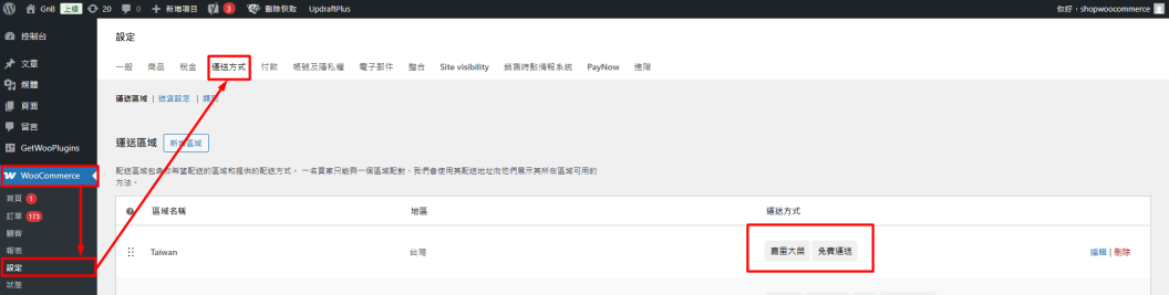 📌注意:您可在 WordPress 管理頁面中,依序前往 WooCommerce > 設定 > 運送方式,查看所有可用的運送區域及其運送方式。