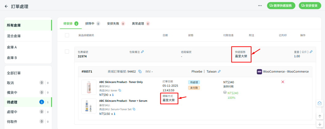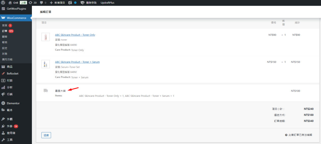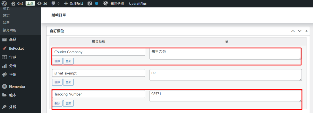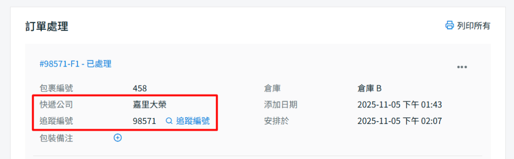 步驟八:當您在訂單處理頁面處理好該訂單後,該訂單中的快遞公司與追蹤編號資訊將同步至 WooCommerce 訂單詳細資料頁。