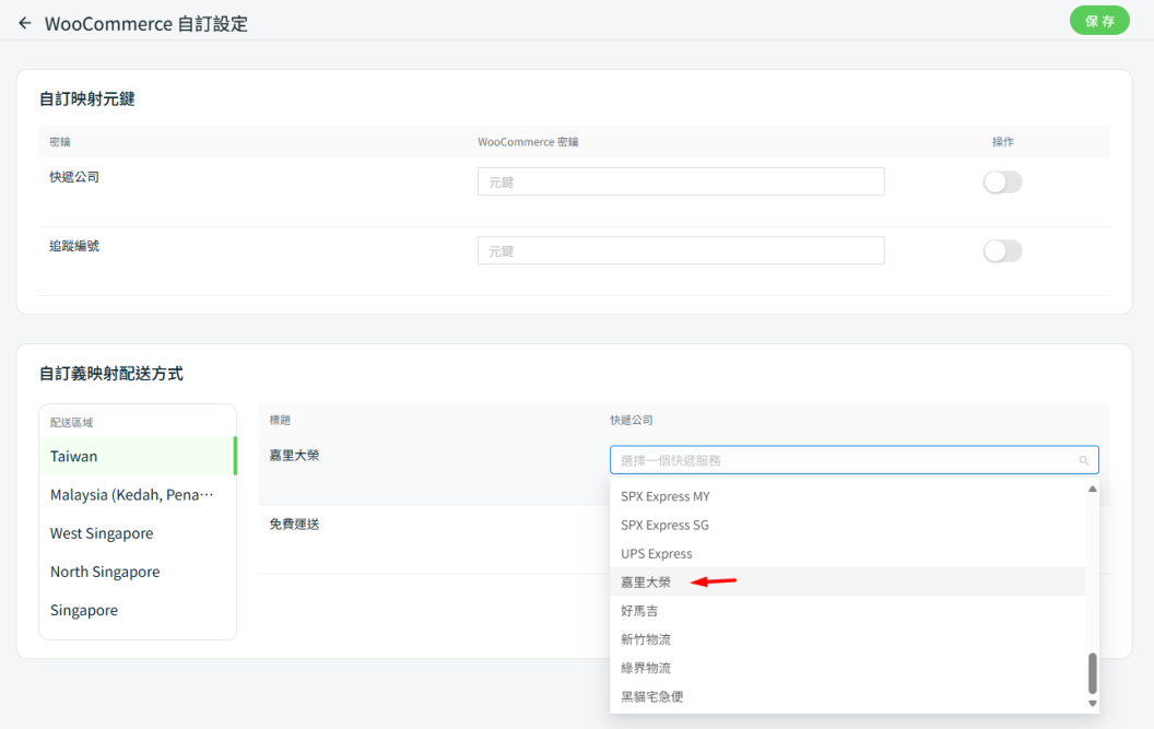 步驟四:在自訂映射元鍵區段中,選擇要與 WooCommerce 快遞公司匹配的 SiteGiant 快遞公司。