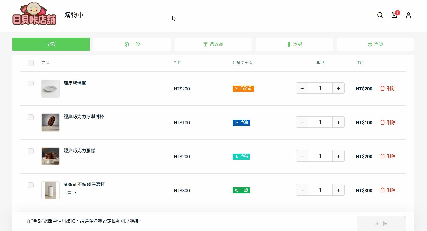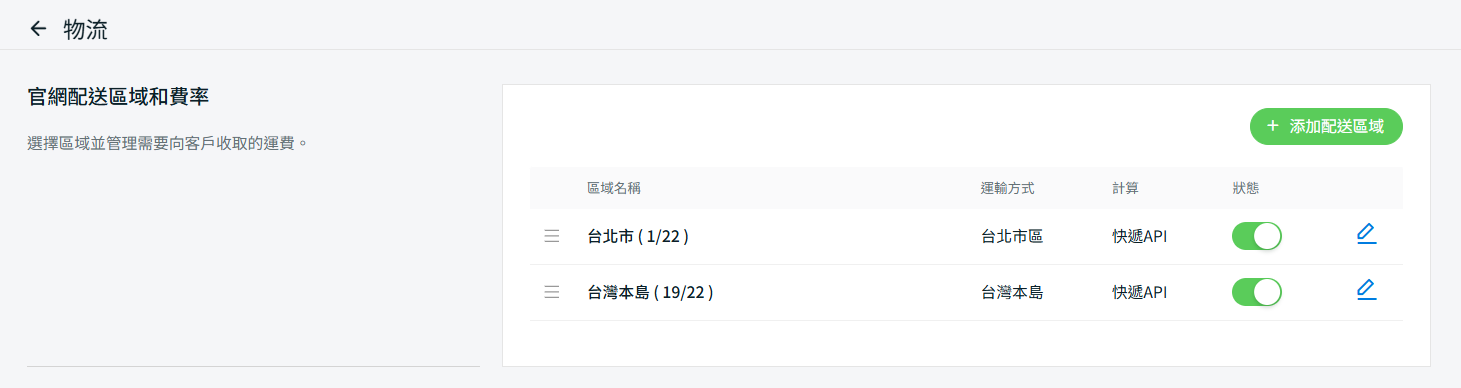 您是一家台灣雜貨店商家,僅支援配送至台灣本島。此外,您僅提供蔬菜與冷凍食品配送服務至台北市。在運輸方式與費率設定中,您僅使用 Lalamove 快遞將蔬菜與冷凍食品配送於台北市,並使用綠界物流配送其他商品至台灣本島。