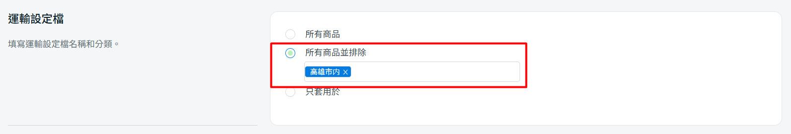 2. 所有商品並排除:運輸方式將採用於所有商品,但不包括添加在所選運輸設定檔中的商品。