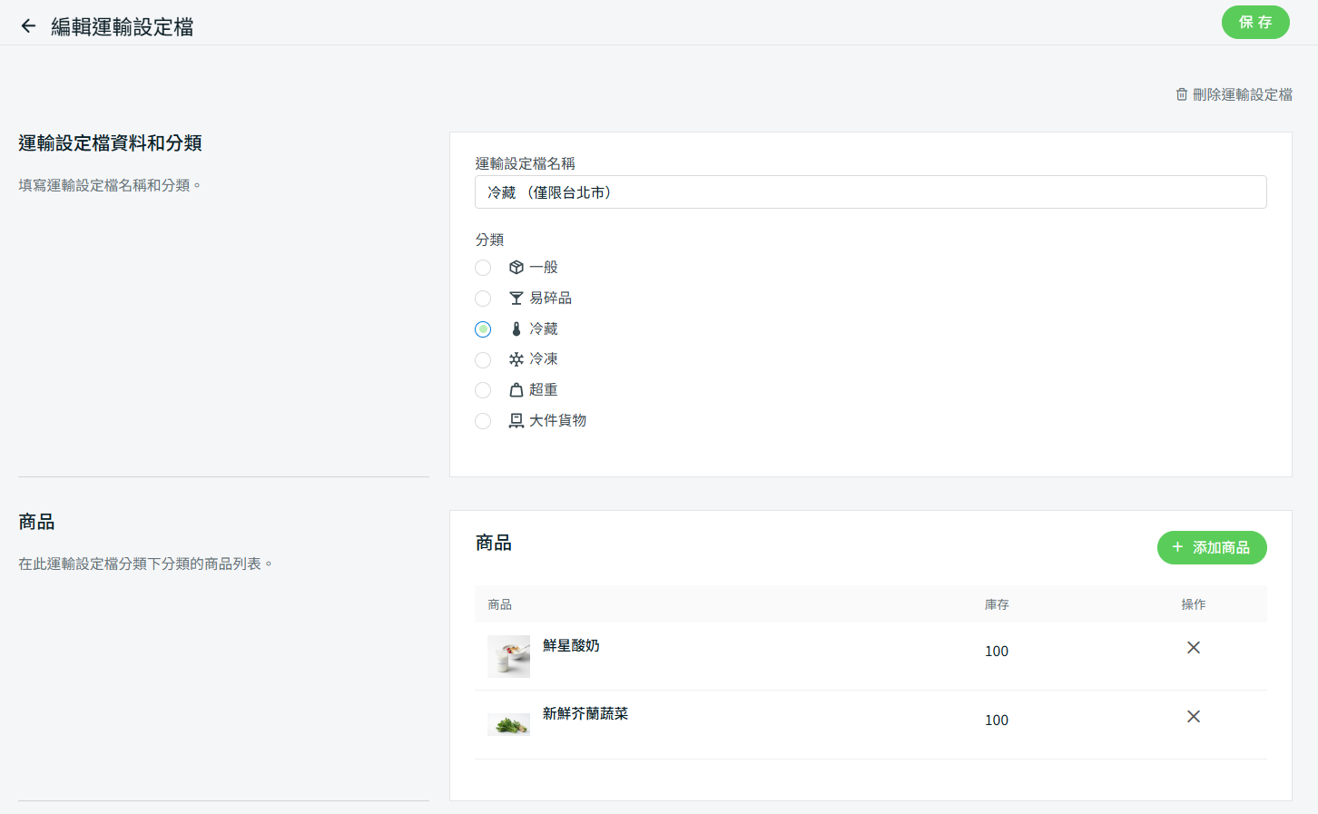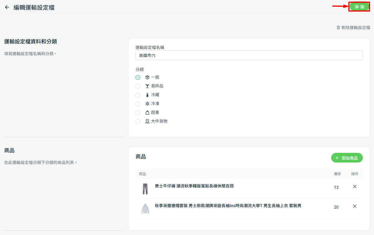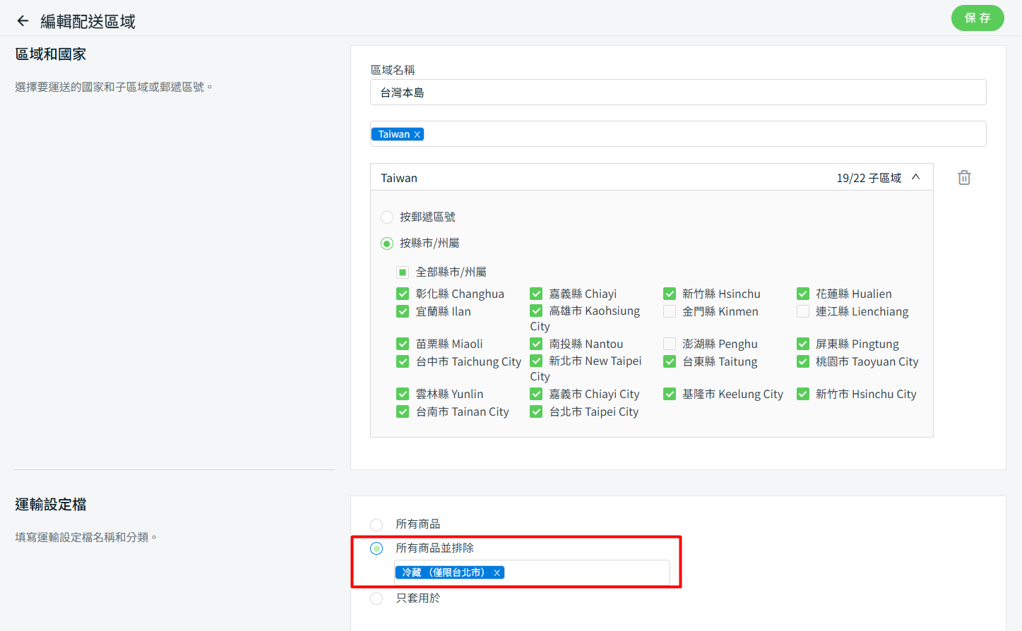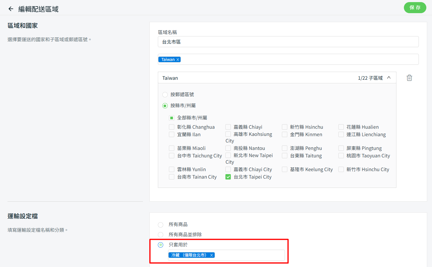 步驟三:前往只限台北的運輸方式 > 在運輸設定檔下,設置只套用於冷藏(僅限台北市) > 保存。