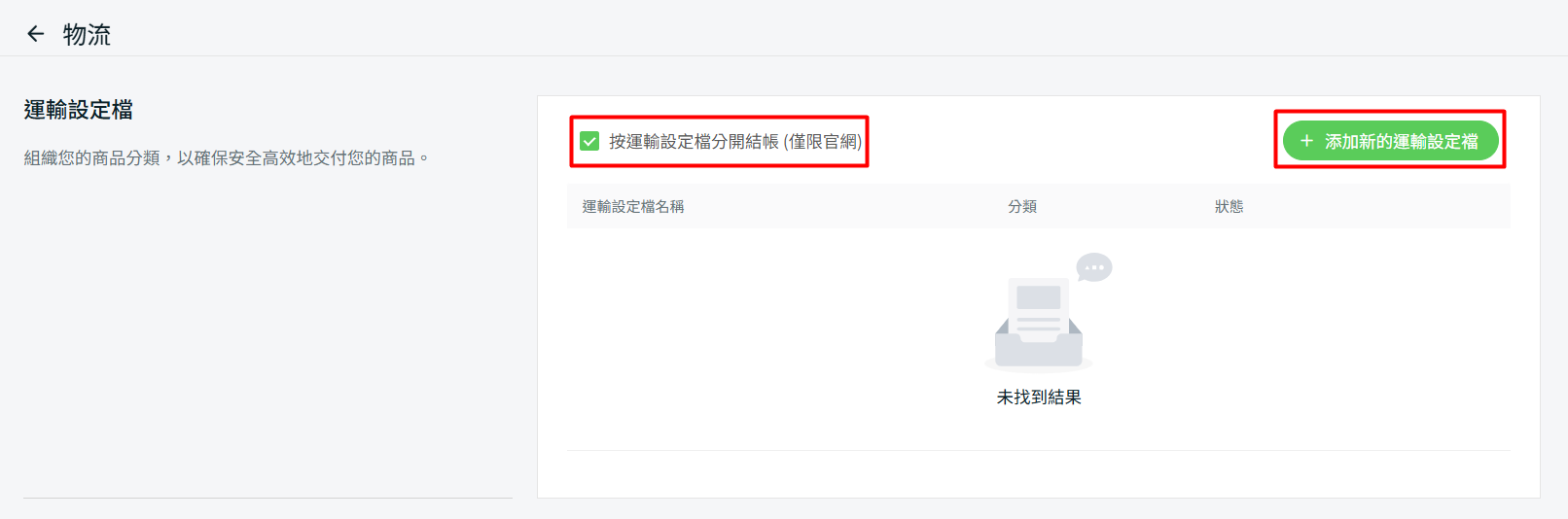步驟二:在運輸設定檔部分,勾選按運輸設定檔分開結帳 (僅限官網)(選填)> 點擊 + 添加新的運輸設定檔。