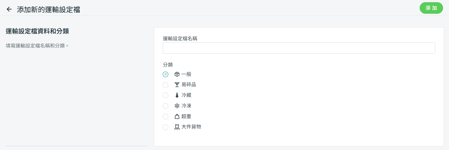 步驟三:填寫運輸設定檔名稱 > 選擇分類。